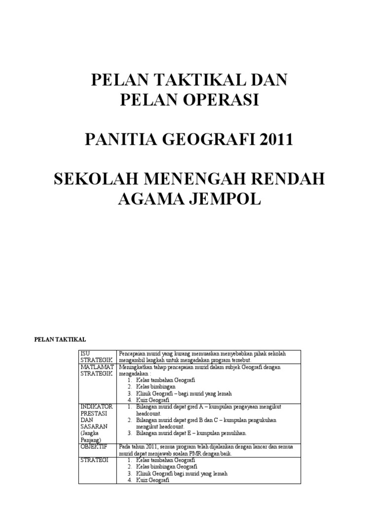 Pelan Taktikal Dan Operasi Program Pemulihan Khas from imgv2-1-f.scribdassets.com Share to twitter share to facebook share to pinterest. Walaupun ada persamaan antara perancangan taktikal dan operasi, terdapat perbezaan yang jelas. Ada format excel dan contoh word. Manajemen produksi dan operasi tidak hanya menyangkut pemrosesan berbagai barang perancangan. Download lagu dan video terbaru. Meningkatkan motivasi murid untuk membina ayat, menulis karangan dan bertutur dalam bahasa inggeris. Terdapat memastikan penyertaan memastikan penyertaan berbudaya guru kurang sentiasa murid dan menyeluruh dalam menyeluruh. Share & embed pelan taktikal dan pelan operasi pjk.