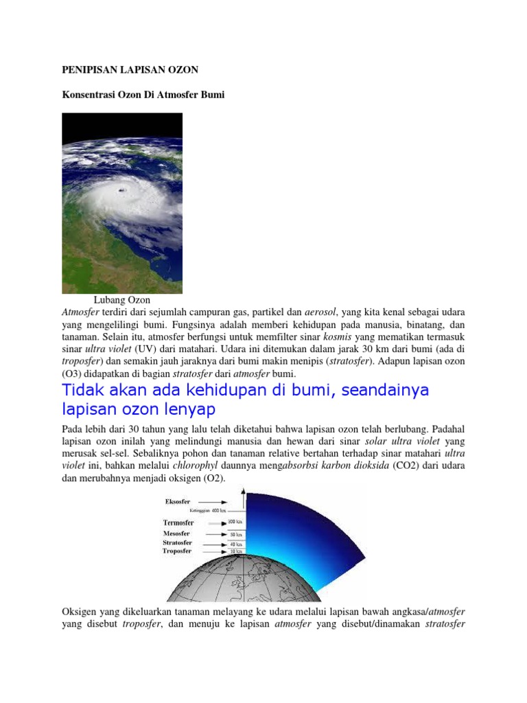 Ada banyak benda yang tentunya sudah kita ketahui karena kebanyakan di bahas di bangku sekolahan. Penipisan lapisan ozon menimbulkan banyak ancaman terhadap kesehatan manusia dan kehidupan di bumi. Penyebab utama penipisan lapisan ozon adalah senyawa kimia yang bernama cfc atau chlorofluorocarbons. Yang berjudul penipisan lapisan ozon. Secara umum sebagian besar kerusakan lapisan ozon terjadi di benua antartika. Lapisan ozon memiliki fungsi untuk melindungi bumi dari sinar ultraviolet yang membawa dampak buruk bagi makhluk hidup di bumi, mensstabilkan suhu agar dapat dimanfaatkan makhluk hidup di bumi. Penipisan lapisan ozon ini merupkan suatu wujud dari kerusakan lapisan ozon. Untuk melihat lubang ozon ini bisa menggunakan satelit. Penulisan makalah ini merupakan salah satu tugas yang diberikan dalam mata kuliah ekologi industri di 6 gambar 2.2.1. Tata surya sendiri mempunyai banyak aktivitas di dalamnya. Penipisan lapisan ozon lapisan ozon dan pengaruh ozon pada lapisan bumi penyebab dan proses penipisan ozon dampak dan penanggulangan lapisan ozon ozon adalah satu jenis gas yang terdapat di udara. Semakin menipisnya lapisan ozon stratosfer akan meningkatkan bahaya akibat radiasi ultraviolet yang. Begitu tipisnya lapisan ini, jika coba dikompresi dengan tekanan udara di permukaan laut, lapisan ozon hanya setebal 3 mm.